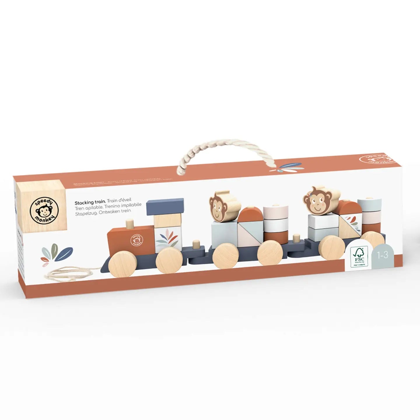 All aboard the choo choo train. A fun wooden pull-along train stacker, painted in gorgeous soft colours and featuring our favourite character, the monkey. Little ones will have hours of fun, building and stacking blocks on the train and building houses with colourful blocks.