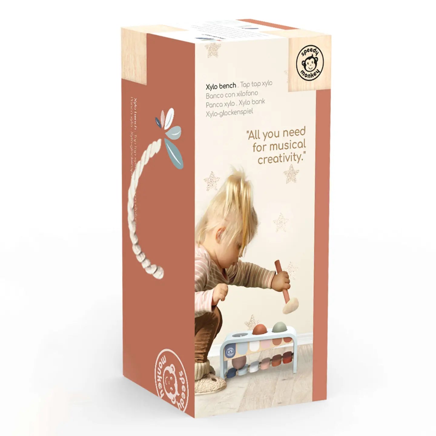 This all-wooden Xylo "bench" is a thoughtful 2 in 1 toy with hammer bench on one side and xylophone on the other. It includes three balls which little ones can hammer down into the slots to make vibrant sounds as they land below. Flip it over and use the xylophone to create a tune. Fun, colourful, durable and safe with no rough or sharp edges. This fun toy helps toddlers acquire and strengthen their logic, coordination, and cognitive abilities. This toy is crafted from sustainably sourced wood from FSC® certified forests and coated with non toxic paint.